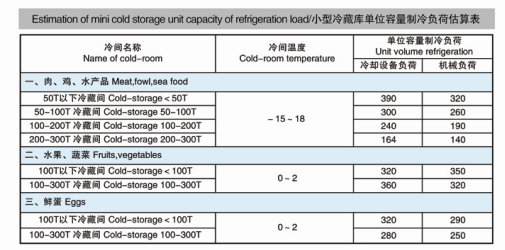 小型冷藏庫單位容量制冷負(fù)荷估算表