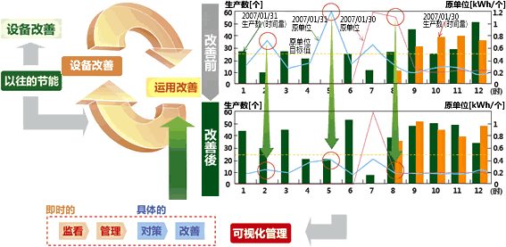 以往的設(shè)備節(jié)能是以「引進(jìn)節(jié)能設(shè)備?機(jī)器?新技術(shù)」即設(shè)備改善為主體,是針對點的改善。三菱電機(jī)認(rèn)為「依據(jù)可視化管理具體把握能量消耗的動向,做到庫華制冷適合化」這種通過可視化管理將設(shè)備改善與運(yùn)用改善綜合鏈接的活動才是持續(xù)節(jié)能的重點所在。如圖所示:
