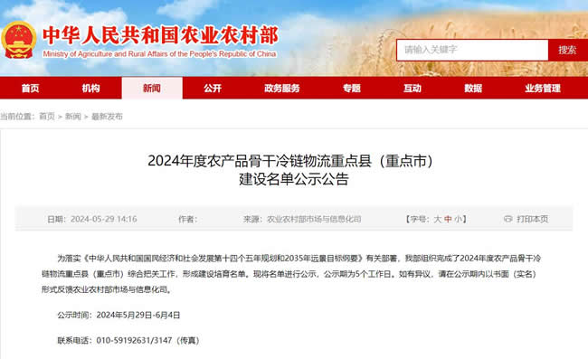 為落實《中華人民共和國國民經(jīng)濟和社會發(fā)展第十四個五年規(guī)劃和2035年遠景目標綱要》有關(guān)部署,我部組織完成了2024年度農(nóng)產(chǎn)品骨干冷鏈物流重點縣(重點市)綜合把關(guān)工作,形成建設(shè)培育名單。現(xiàn)將名單進行公示,公示期為5個工作日。如有異議,請在公示期內(nèi)以書面(實名)形式反饋農(nóng)業(yè)農(nóng)村部市場與信息化司。